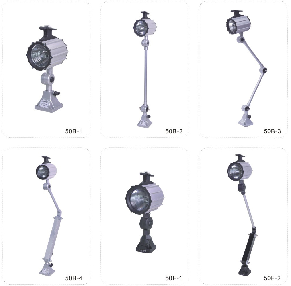 JS.109002 50B、50F系列工作燈 50B-1工作燈采用新光源鹵鎢燈泡,光線柔和,聚光性好,適用各中小型機床,數(shù)控機床,鉆銑床、組合機床及其它設(shè)備的照明,并具有防水、防爆、防侵蝕等優(yōu)點。 50B-2適用于各種機床,數(shù)控機床和專用機床的跟隨定位照明,同時具有以上特點。 50B-3、4適用于各種中型機床長距離照明,分別具有以上特點。